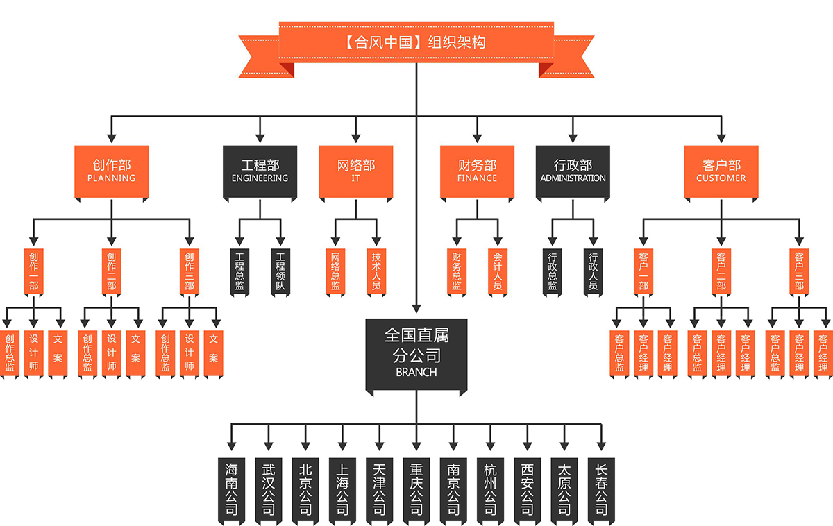 構建完善的運營體系和管理組織系統,并在全國各地直屬公司相互配合項目及人才等資源。客戶部(國際化思維,本土化溝通)、創作部(創意領先,向左,你就是第一)、工程部(精雕細琢,成就唯一)、財務部(高起點,成就堅實后盾)、行政部(高效,快速反應)。創意決定實力,我們吸收廣告界的創意人才,我們有足夠的自信心,所以我們把分公司開到了全國。有人才、有視野、有歷練,自然就有實力。